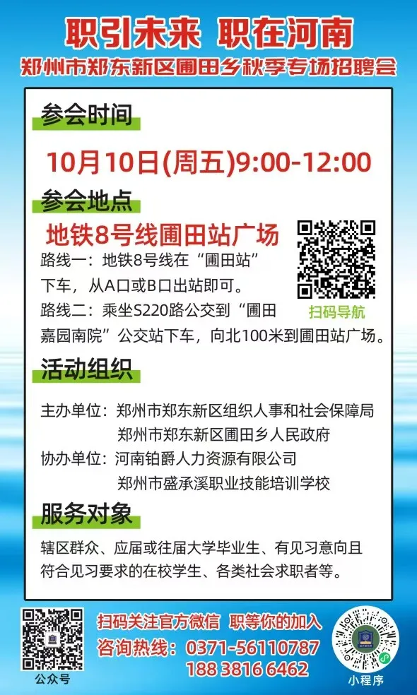 “职引未来 职在河南”郑州市郑东新区圃田乡秋季专场招聘会即将启幕